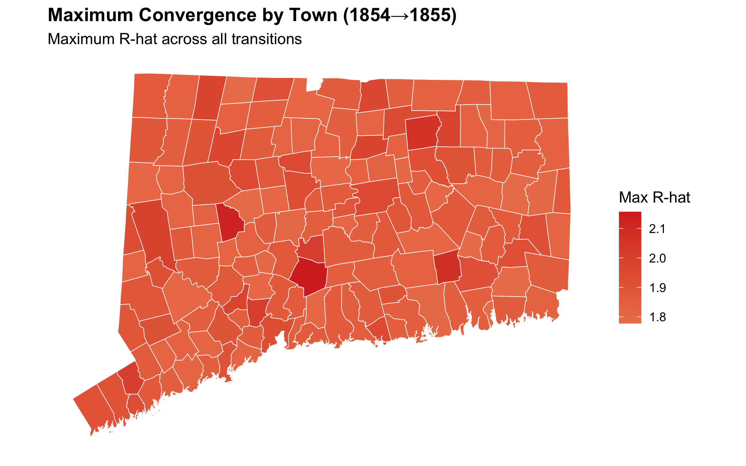 We can also see that high R-hat values are fairly uniformly distributed across the state, suggesting that the model’s failure to converge is not due to a small number of outlier towns but rather to widespread local variation in voter behavior.