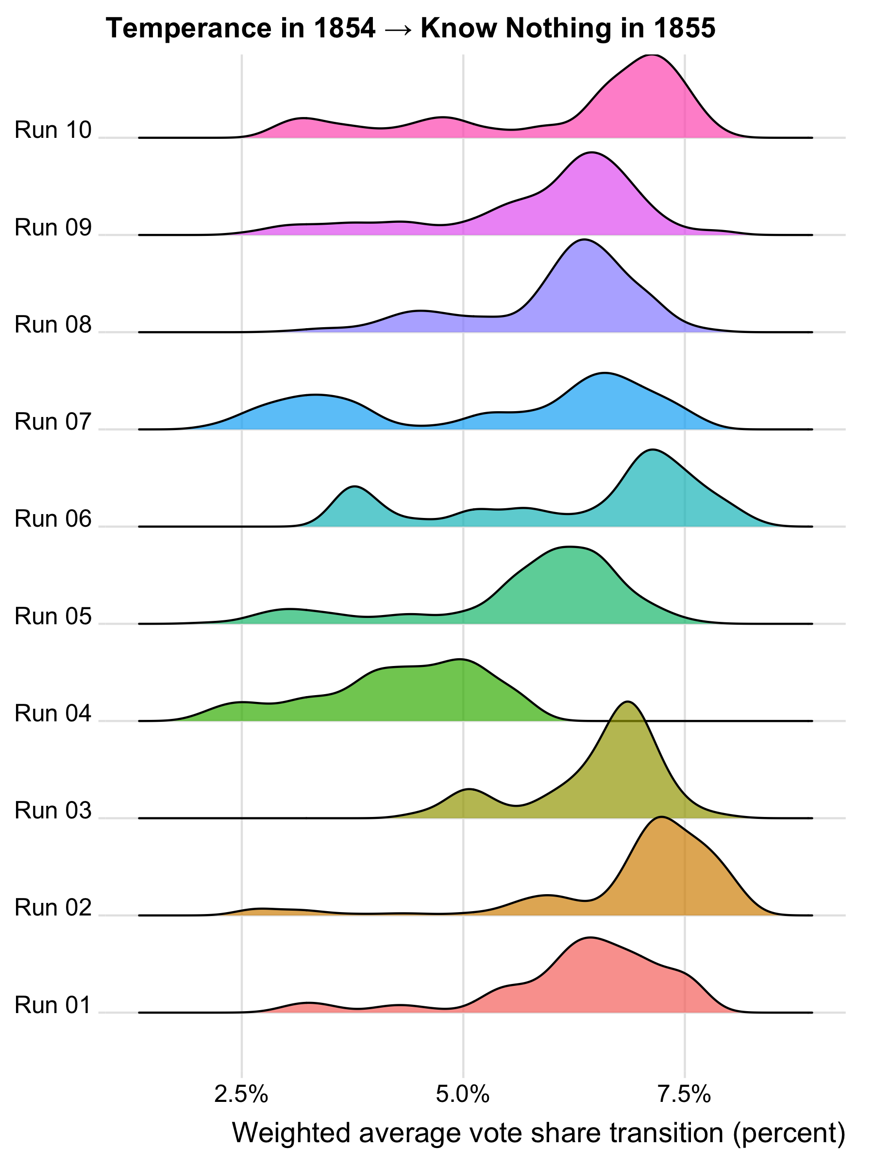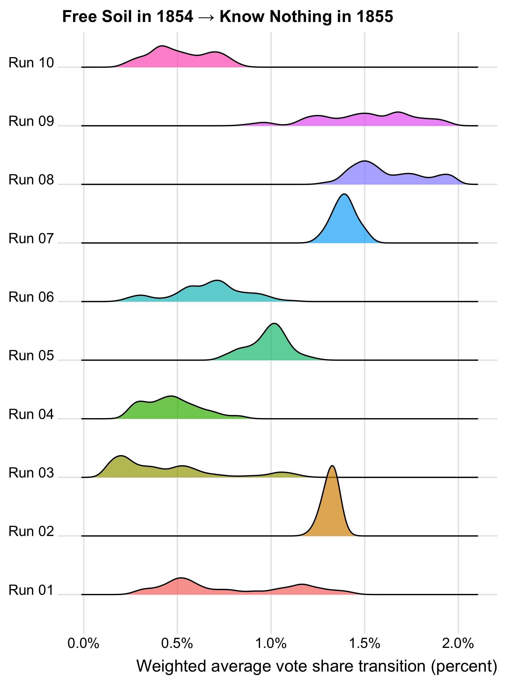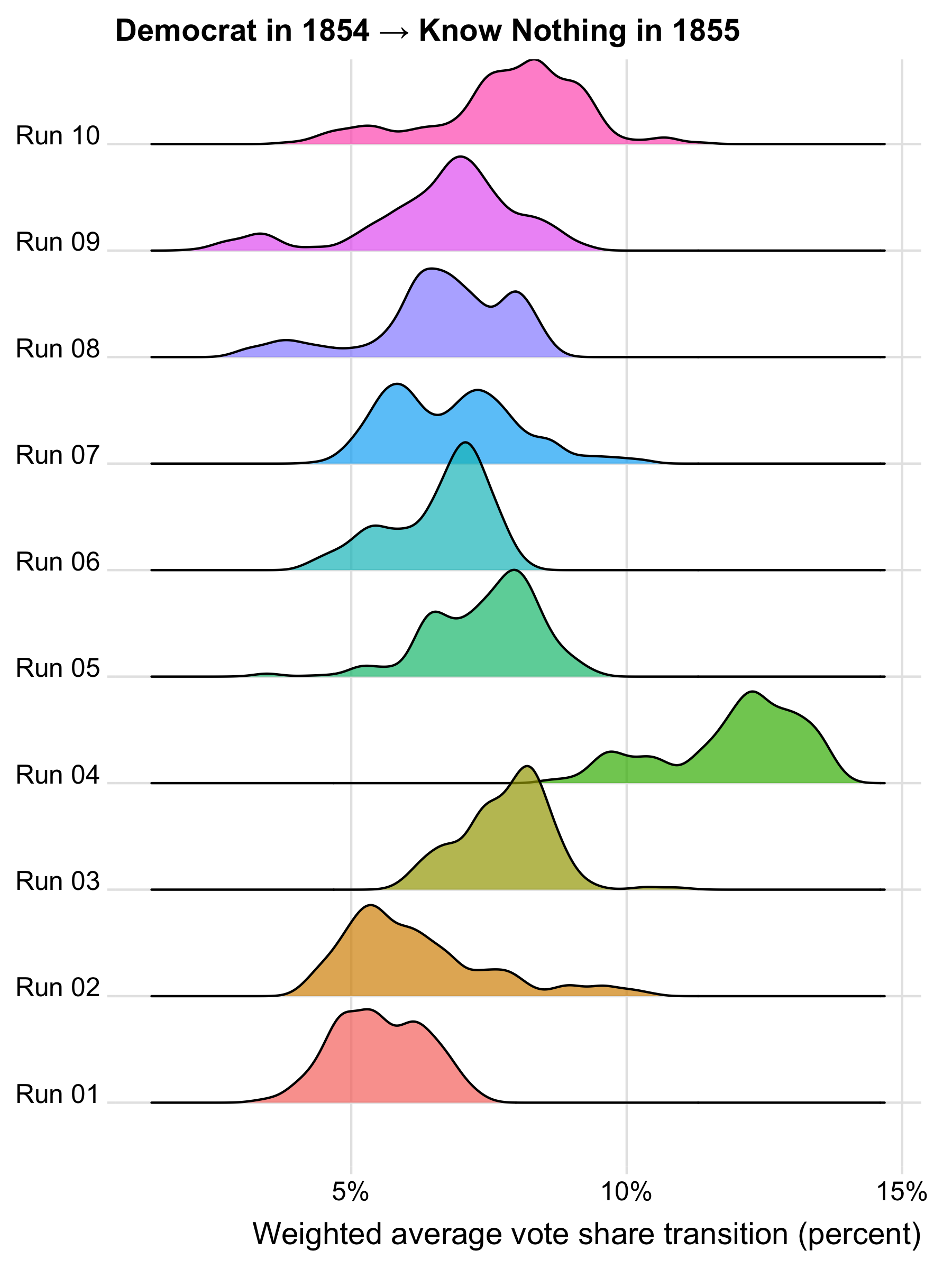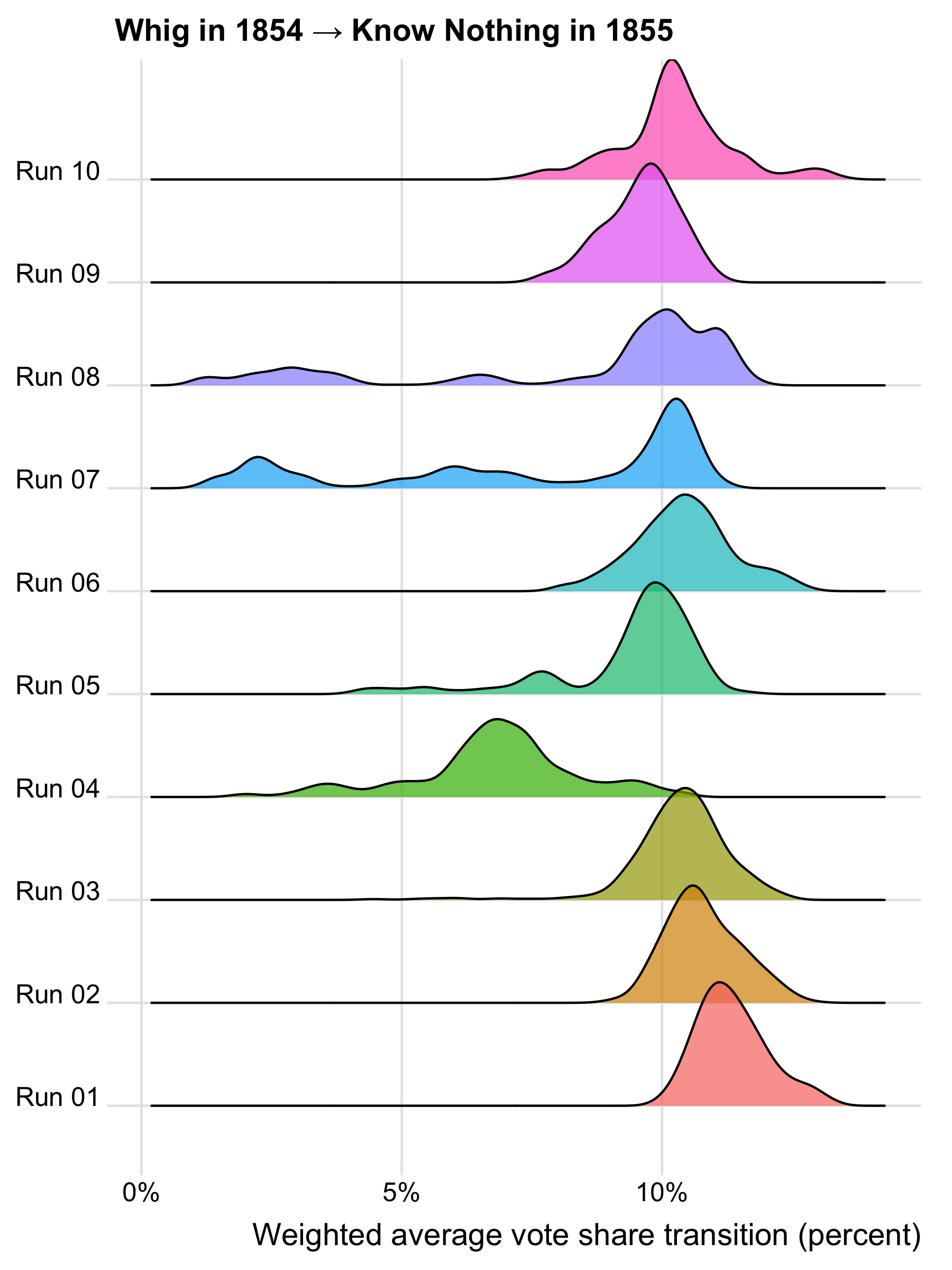 Where the distributions for multiple runs align, we likely have a genuine signal of voter transitions, such as runs 1, 2, 3, 5, 6, 9, and 10 for the 1854 Whig transition, which are centered on a value of roughly 10% or slightly more. Runs 7 and 8 are interesting because they show a dominant mode at just over 10% but also a secondary mode at roughly 7%, which corresponds to the value found in run 4. The fact that the dominant mode is close to the value found in other runs suggests that runs 7 and 8 aren’t outliers but are detecting a genuine signal of voter transitions. The fact that the secondary mode in runs 7 and 8 is close to the value found in run 4 is consistent with run 4 detecting a real but weaker signal of voter transitions.